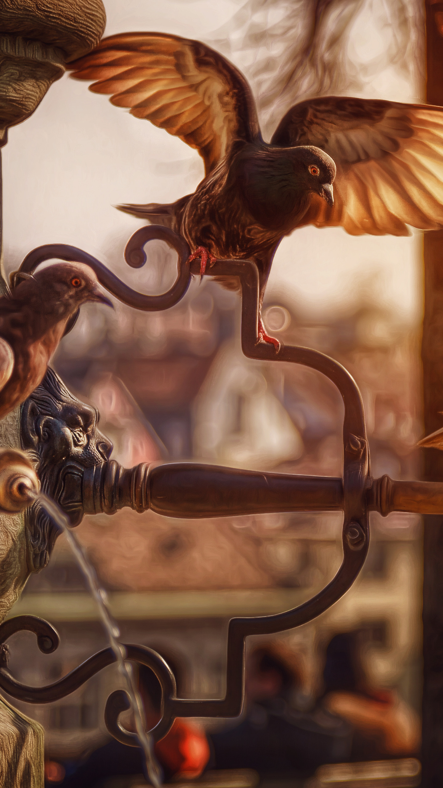 Скачать картинку 1440x2560 голуби, фонтан