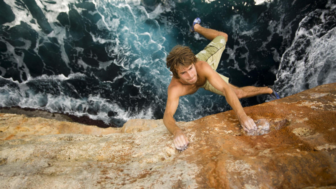 Скачать картинку 1366x768 скалолаз, выступ, парень, скала, пучина