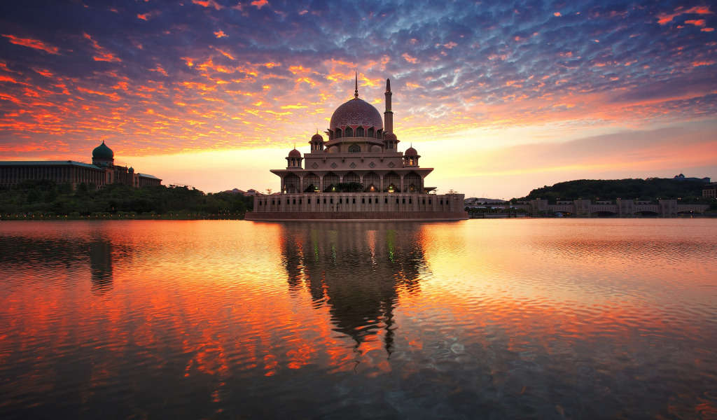 Скачать картинку 1024x600 собор, отражение, закат, малайзия