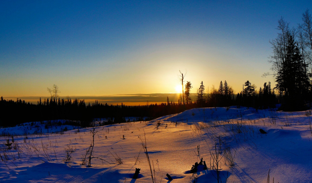 Скачать картинку 1024x600 снег, зима, рассвет, холмы
