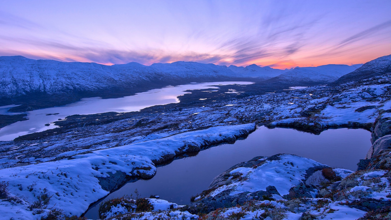 Скачать картинку 1366x768 снег, зима, горы, холмы, озера