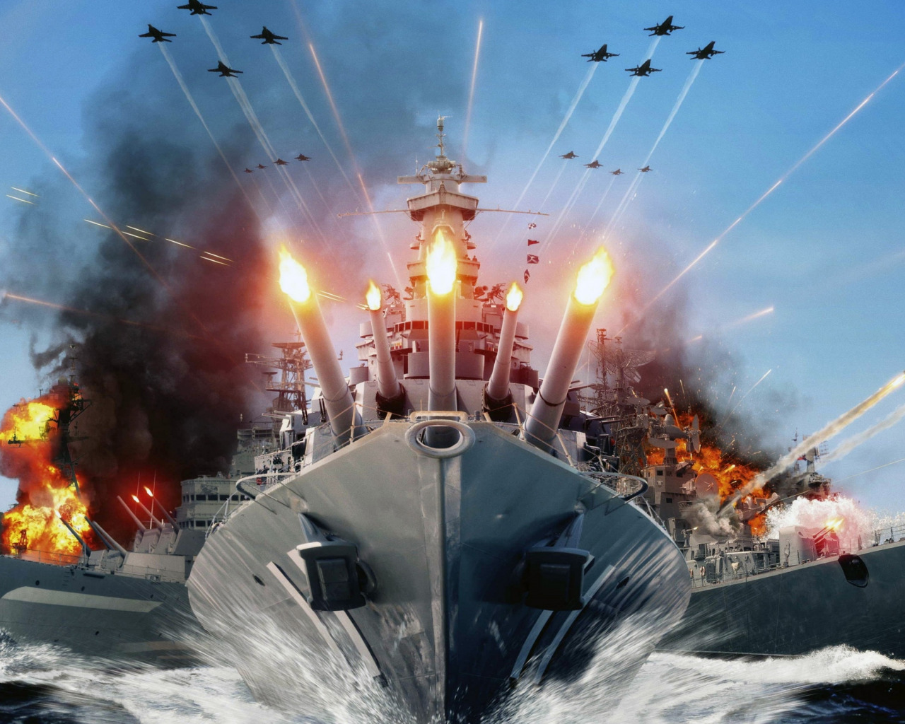 Скачать картинку 1280x1024 корабли, выстрелы, огонь, взрывы