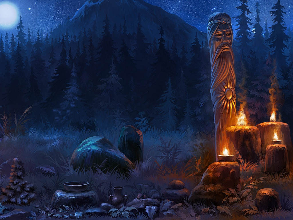 Скачать картинку 1024x768 статуи, костры, друиды, поляна, ночь