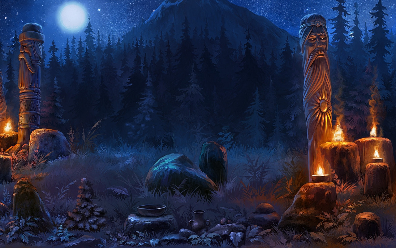Скачать картинку 1280x800 статуи, костры, друиды, поляна, ночь