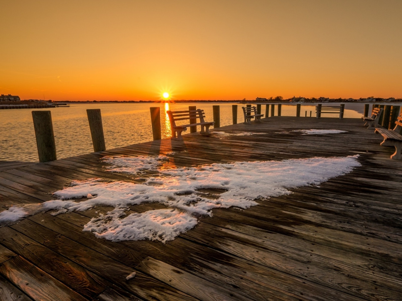 Скачать картинку 1280x960 рассвет, причал, снег, зима