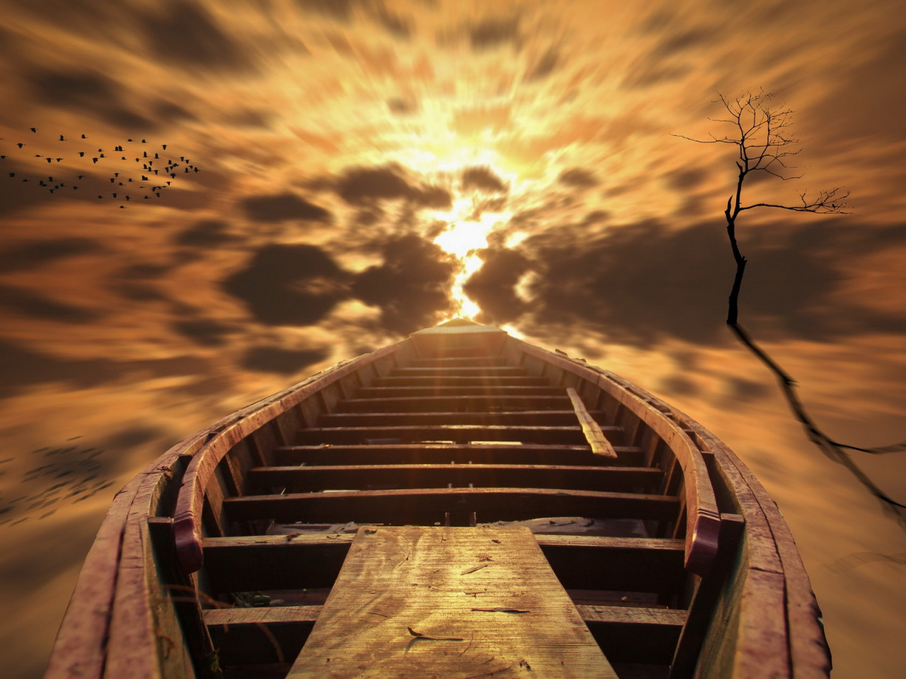 Скачать картинку 1280x960 лодка, деревянная лодка, небо, птицы